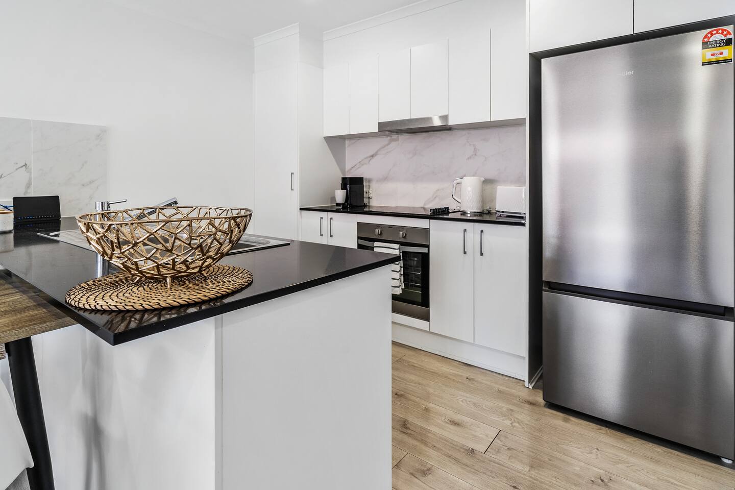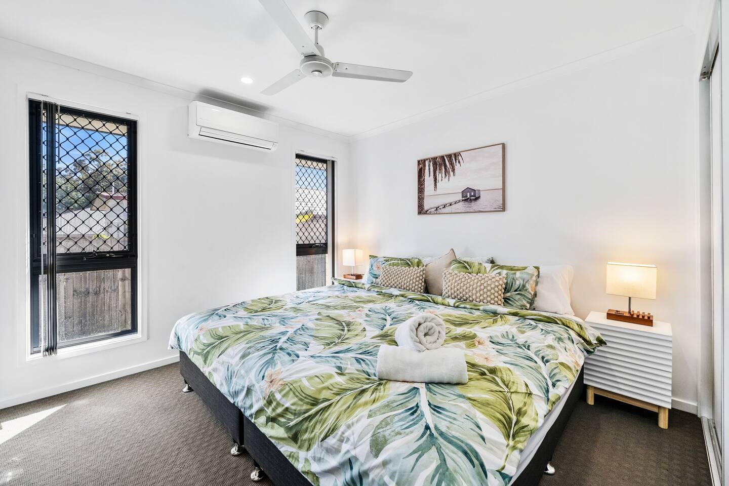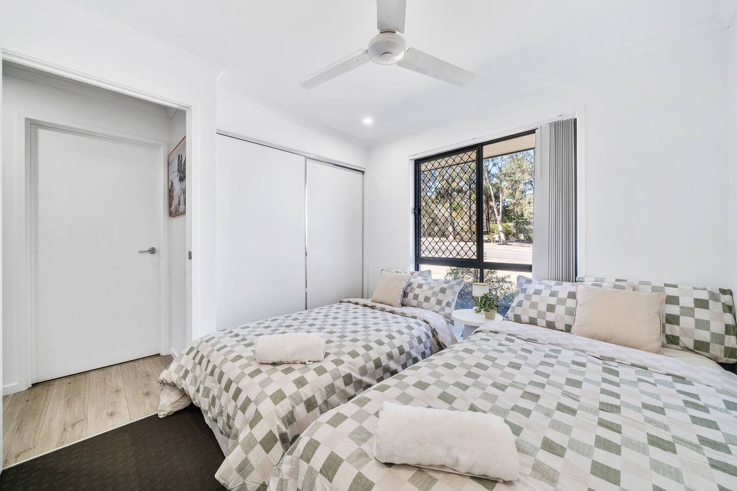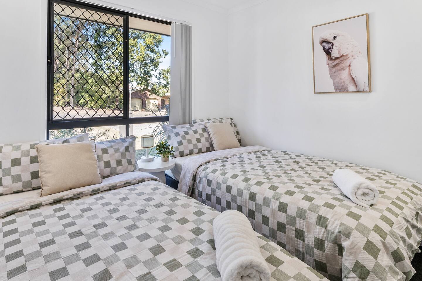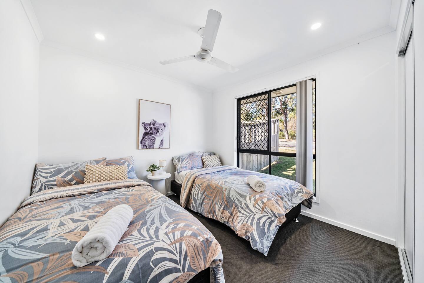**Bedrooms:** The home features three bedrooms with 6 king single beds, each designed for a restful night's sleep. - **Bathrooms:** Two modern bathrooms ensure there's plenty of space for everyone to freshen up and relax. - **Living Area:** Relax in the living area, complete with cozy seating, dining table and a flat-screen TV for your entertainment. - **Kitchen:** The fully equipped kitchen has everything you need to prepare delicious meals during your stay. - **Garage:** The property includes a single-car garage, providing secure parking for your vehicle. **Additional Options:** Need more space? You can book both halves of the duplex for larger groups or families. Check out our other listing Katandra to reserve both units and enjoy double the space and amenities.