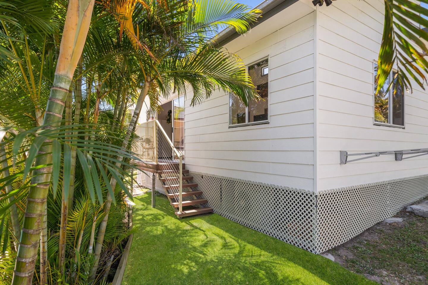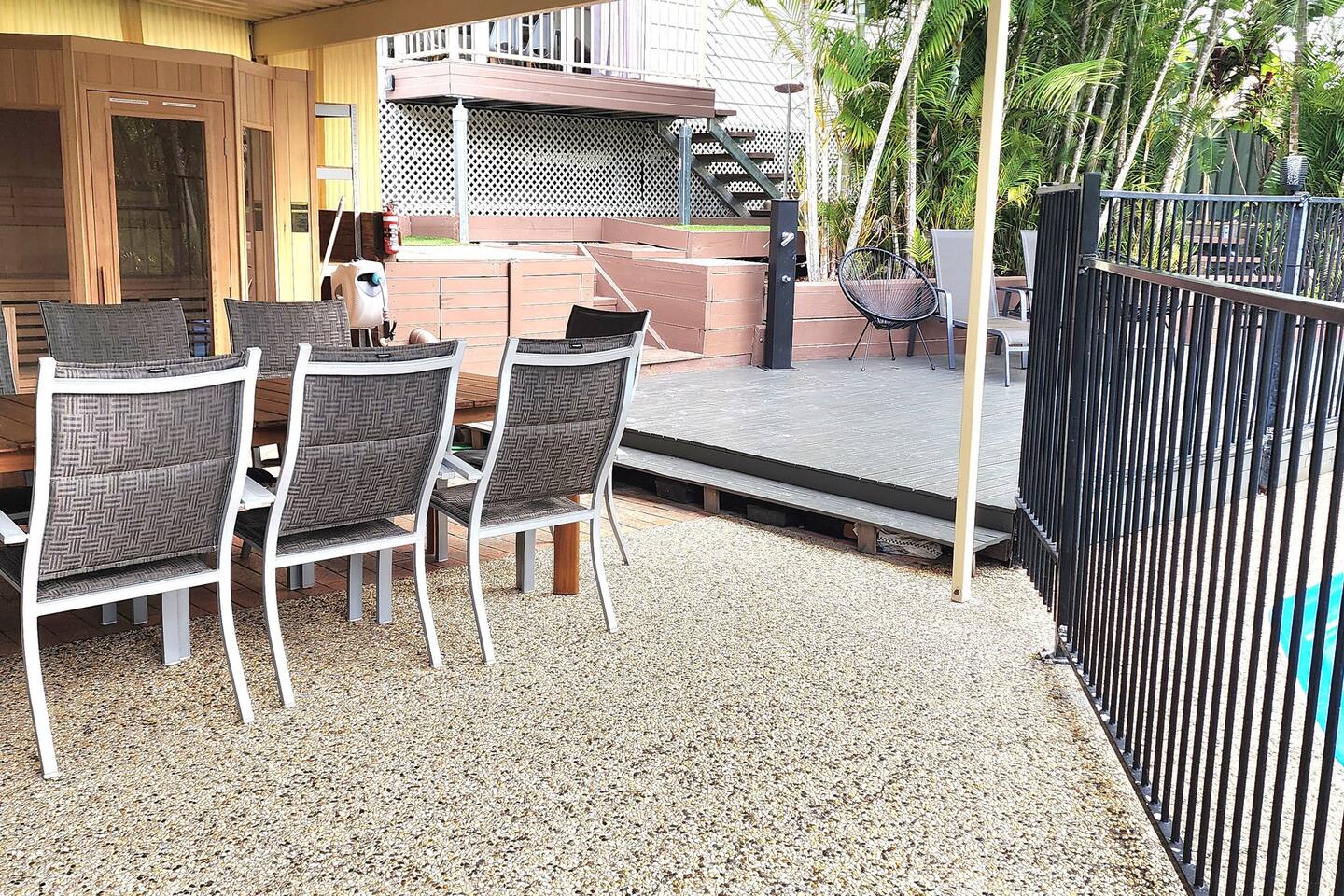 The primary house features two levels, comprising four air-conditioned bedrooms and two bathrooms upstairs. Downstairs, you'll find a living area, bathroom, and kitchen. Additionally, the granny flat offers two bedrooms, one bathroom, and a kitchen. Step outside to enjoy the expansive outdoor area, which boasts two decks, a trampoline, playground, pool, and sauna.